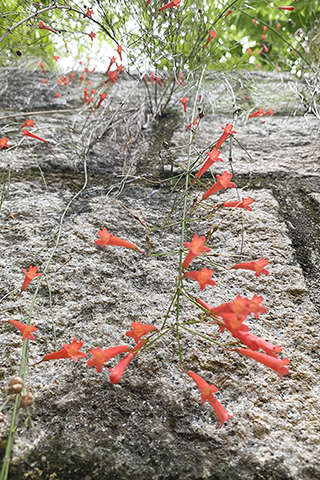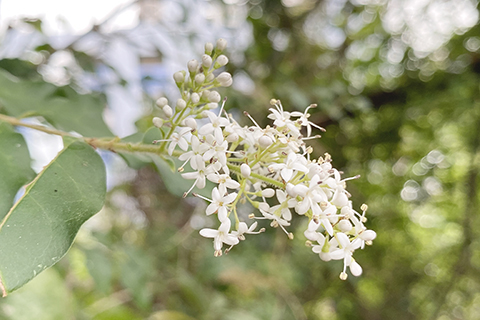 沿著健康徑,一簇簇潔白的女貞掛滿枝頭且清香四溢、一串串鮮紅的爆仗竹隨著纖細的枝條垂掛於石牆上、身為深圳市花的三角梅顯得極為張揚、白裡透紅的石斑木一叢叢地立於枝頭,紫的白的鴛鴦茉莉靜靜地展開柔軟的花瓣、高大的蒲桃樹上也開著朵朵花兒,還有各種叫不出名字的花兒,在美好的春日努力地綻放屬於自己的美麗。◇