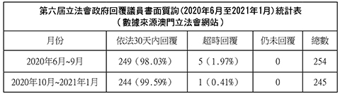 對此,我們的團隊在行政當局自去年6月1日承諾會對議員的書面質詢回覆工作作出改善後,再對議員的書面質詢回覆進行追蹤性的調查及統計(見上表),發現2020年6月至9月(去年第三季度)依法在30天內的回覆率有98.03%,而2020年10月~2021年1月(去年第四季度)回覆率再升到99.59%,說明行政當局在針對性處理書面質詢回覆的工作中取得了階段性成效。