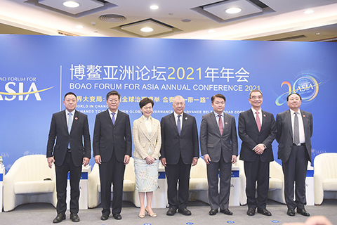 ◎ 四月二十日,博鰲亞洲論壇二0二一年年會「城市群帶動發展:以粵港澳大灣區為例」分論壇在海南省博鰲舉行,全國政協副主席何厚鏵(中)出席並作主旨演講,香港特別行政區行政長官林鄭月娥(左三)、澳門特區政府經濟財政司司長李偉農(右三)、珠海市委書記郭永航(左二)、中國國際經濟關係學會會長李若谷(右一)、北京大學國家發展研究院名譽院長林毅夫(右二)現場出席,博鰲亞洲論壇粵港澳大灣區建設澳門委員會主席梁維特(左一)主持分論壇。(中新社記者侯宇攝)