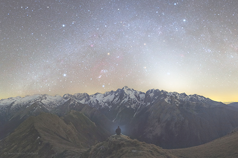 在它上方的星空中,可見到崎嶇西方地平線附近的獵戶座眾星和冬季銀河。其中,獵戶肩部的參宿四是視野裡泛黃的三顆亮星之一。它與右下方的紅巨星畢宿五,以及銀河下方沉浸在明亮黃道光裡的火星(右上),構成一座天體三角。