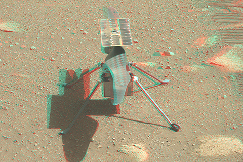 在四月五日(第四十六個火星日),毅力號火星車的桅桿相機Z,為靈巧號火星直升機拍下了這幅多彩的立體特寫影像(請用紅/藍眼鏡觀看)。