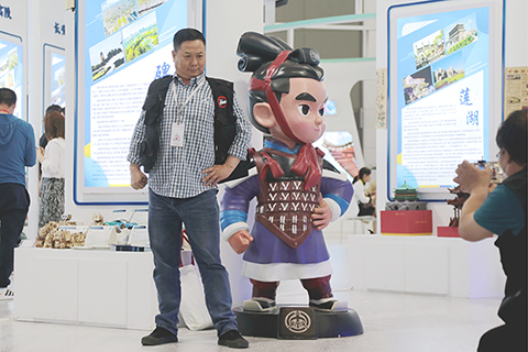 ◎ 五月十一日,第五屆絲綢之路國際博覽會暨中國東西部合作與投資貿易洽談會在西安開幕。本屆大會以「互聯互通.共建共享」為主題,會期五天。來自比利時、韓國、塔吉克斯坦、几內亞等九十八個國家和地區的駐華使節和境外嘉賓共聚西安,推動高質量共建「一帶一路」。圖為展商與「秦武士」合影。(中新社)