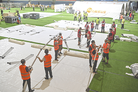 ◎ 六月一日,廣東省廣州市廣州體育館,工作人員搭建「獵鷹號」氣膜方艙實驗室。當日,首個「獵鷹號」氣膜方艙實驗室搭建完畢並投入使用,其餘三個「獵鷹號」氣膜方艙實驗室正在建設階段,預計六月三日投入使用,屆時四組「獵鷹號」氣膜方艙方艙實驗室日核酸檢測產能可超十二萬管。(中新社)