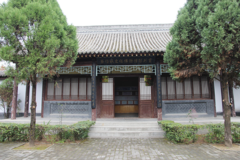 出了拜殿,撞見兩株古柏,不知植於何代,需兩人方能合圍,挺拔的樹杆直刺蒼穹,蒼翠的枝葉在初冬的風中顯得格外精神。這兩棵無言的老樹,陪伴著墓室的主人,走過了多少歲月,已無法考證,它們無疑是蔡倫最忠實的伴侶。在獻殿內,陳列著在遺址上發掘出來的許多鏽跡斑斑的造紙工具,據說是當時造紙時用過的。祠區和墓區翻修過程中發掘出土的一些漢磚、晉磚、漢瓦、明瓦及陶灶等也整齊地陳列在殿內,彷彿把人帶進了舊時的造紙作坊,讓人對古代造紙術有了初步的認識。