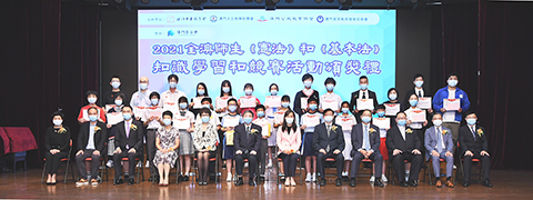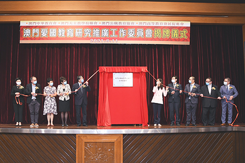 由澳門中華教育會、澳門天主教學校聯會、澳門公職教育協會、澳門高等教育發展促進會聯合舉辦,「澳門愛國教育研究推廣工作委員會揭幕儀式」及「二0二一全澳師生憲法、基本法知識學習競賽頒獎典禮」昨日下午五時假濠江中學校本部舉行,社會文化司司長歐陽瑜、中聯辦副主任羅永剛、外交部駐澳門特派員公署副特派員王冬、教育及青年發展局局長老柏生、中聯辦教育與青年工作部部長徐婷、澳門基金會主席吳志良、澳門愛國教育研究推廣工作委員會主席陳虹、副主席周伯輝、劉文堯及莫啟明等主持揭牌儀式。