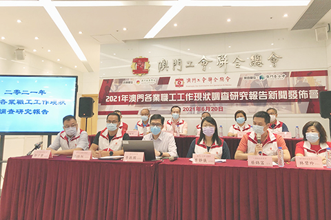 澳門工會聯合總會與經濟學會昨日下午三時舉行聯合發佈會,介紹「二零二一年澳門各業職工工作現狀調查研究報告」結果。會上,經濟學會副理事長李振國介紹有關調查狀況,表示是次調查對象為十六歲及以上的澳門就業人士,共回收的有效問卷六千七百三十份。調查結果顯示逾四成五受訪者收入與疫情前相比有所減少,當中,受訪者中收入減少比例超過五成的行業有:會展業、交通運輸業、製造業、博彩旅遊業、酒店餐飲業、批發零售業以及建築業;逾六成受訪者對工作感憂慮,與二零一九年相比,「感憂慮」比例有所上升,憂慮的原因前三位分別是行業前景不佳、工作競爭激烈,以及職位被外地僱員取代等。