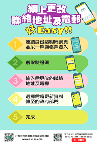 市民經身份證明局網頁(www.dsi.gov.mo)使用上述服務時,須以「澳門公共服務一戶通」帳戶登入系統,並透過其居民身份檔案內登載的流動電話號碼接收驗證碼,獲確認後便可更新聯絡地址及電郵。如需更改未成年子女的聯絡地址及電郵,只須輸入他們的身份證號碼便可同時更新資料。成功提交申請後,身份證明局將於申請翌日起計三個工作天內作出處理,且完成處理後,身份證明局會發出短訊通知。