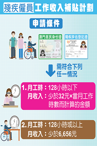 凡持有由社會工作局發出有效的殘疾評估登記證的澳門居民,並符合按月累計工作總時數少於一百二十八小時,且當月工作收入少於《僱員的最低工資》規定的每小時最低工資金額三十二澳門元乘以當月實際提供工作時數而計算的金額;又或符合按月累計工作總時數等於或多於一百二十八小時,且當月工作收入少於《僱員的最低工資》規定的每月最低工資金額六千六百五十六澳門元,均可作出申請。