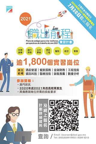 計劃報名期內,收到不少非應屆畢業青年反映希望參加計劃,現因尚有實習崗位可以填補,且實習機構亦有意繼續招募職場新人,故由即日起將報名期延長至本月三十日,除應屆高校畢業生外,亦會接受二0二0年高校畢業生報名,符合資格者宜從速報名,把握機會立即網上報名,詳情可瀏覽勞工事務局網站https://www.dsal.gov.mo/zh_tw/standard/employment_recruitment_local_intern_2021.html,查詢電話八三九九九九0三(雷先生)/八三九九九二一三(陳小姐)。◇