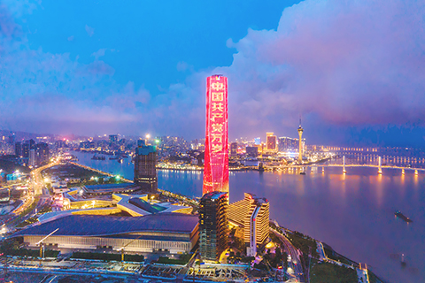 電視畫面中,一場主題為「百年風華,蓮開盛世」的光影秀,以澳門標誌性建築中國銀行大廈為幕布上演,通過光影藝術呈現了南湖紅船、延安寶塔山、天安門以及大三巴、盛世蓮花、澳門旅遊塔、港珠澳大橋等地標,展現了建黨百年的光輝歷程和「一國兩制」下澳門與祖國內地同發展、共繁榮的美好願景。濠江對岸的橫琴,在高空俯瞰下燈火輝煌,一棟棟高樓在夜色中流光溢彩,描畫出橫琴的天際線。
