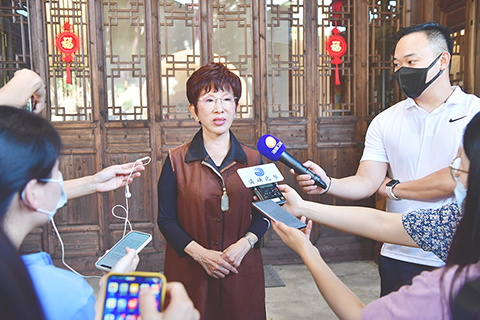 ◎ 七月十八日,中國國民黨前主席洪秀柱在福建省福州市參觀台灣會館。圖為洪秀柱接受記者採訪。(中新社)