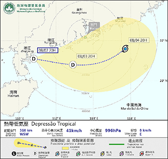 昨晚十一時,熱帶低氣壓集結在本澳西南約二百三十公里,以時速十二公里向東移動。氣象局稱,熱帶低氣壓目前正集結在廣東西部沿岸,未來兩三日將會有所增強並向東移動橫過南海北部,為廣東沿岸帶來不穩定天氣,本澳間中會有大驟雨及雷暴,風力將有所增強及有陣風。預料熱帶低氣壓今日晚間至明日清晨最接近本澳,但其路徑仍存在不確定性,請市民密切留意天氣變化並關注最新風暴消息。