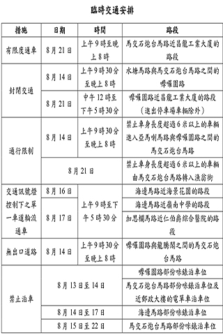 多處道路因賽道重鋪 8月14至21日交通管制 2021-08-13 03:30:00 【特訊】因應體育局重鋪大賽車賽道,八月十四日(周六)至八月二十一日(周六),海邊馬路、嚤囉園路、馬交石炮台馬路、加思欄馬路實施臨時交通安排;巴士方面,「電力公司」站於八月十四日(周六)及八月二十一日(周六)上午九時至晚上八時暫停使用,多條巴士路線需臨時改道行駛及調整停靠站點。詳見附表。◇