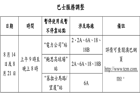 有關巴士路線調整詳情可瀏覽澳巴網頁http://www.tcm.com.mo及新福利網頁https://www.transmac.com.mo,並可關注交通事務局微信公眾號(服務號macaudsat及訂閱號macau-dsat)接收相關資訊。