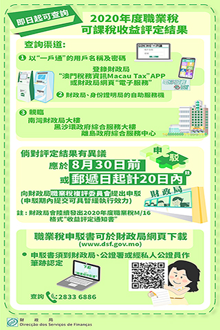 自即日起納稅人亦可事先透過以下渠道查詢職業稅評定收益的結果,(一)使用「一戶通」的用戶名稱及密碼登入財政局移動應用程式「澳門稅務資訊Macau Tax」或財政局網頁「電子服務」、(二)使用財政局、身份證明局的「自助服務機」、(三)親臨南灣財政局大樓、黑沙環政府綜合服務大樓及離島政府綜合服務中心。經查詢後,倘對評定結果有異議,納稅人可自行提出申駁。