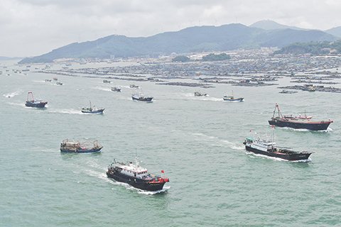 開漁日當天,在海南島西部的臨高新盈港,有約一千二百艘漁船開漁;福建省海域也有九千三百九十艘漁船「解禁」出海,進行捕撈作業。