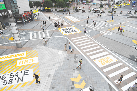 ◎ 八月十七日,重慶觀音橋商圈內的藝術塗鴉十字形斑馬線引人注目。(中新社)