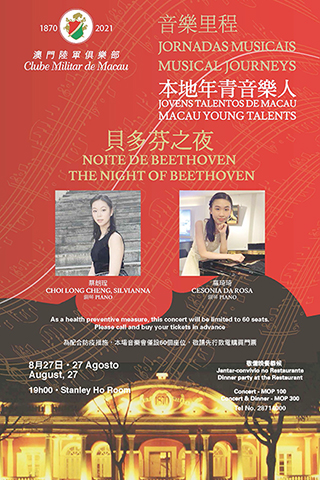 涉任職一游泳會期間假冒公司名義推出「優惠計劃」 澳婦私吞159名學員60萬元學費 工聯與美高梅 將在社區宣傳負責任博彩 岑浩輝與賈桂德大使會面 就強化平台對接等交流 岑浩輝與世貿組織總幹事會面 交流鞏固澳貿易地位等議題 岑浩輝會晤中國常駐世貿組織代表 冀進一步加強相互聯繫 「『休』遊巴士.社區探趣」 兩主題路線今起試運行 涉向三印尼外僱放數並扣起對方證件 三外僱被捕主腦在逃 「澳門青年讀書會」啟動 設系列活動向公眾推廣茶文化 市署首辦「國際茶日嘉年華」 工聯四間托兒所托額抽籤 結果將上載工托網站 國際旅客增逾一成其中泰國客增七成多 今年首季入境旅客按年升逾一成三 「一戶通」將配合發佈演習訊息 「水晶魚民防演習」今舉行 市署禁日本疫區禽肉入澳 警:就有人用電單車運載另一電單車 駕駛者已被檢控 亞洲大學排名 澳大廿八位 科大五十二位 澳高校辦學質量持續進步 華僑報第四十七屆兒童節填色比賽 前五十名獲獎者揭曉 逾二萬人次參觀網上瀏覽亦超過九萬一人次 全民國安教育展開展九日 五月一日至四日在氹仔舊城區及關前後街設置「假期行人專用區」 舉辦多元活動增節慶氛圍 首季於渠道清出三百四十噸垃圾並巡查二百五十間食肆的隔油井 市署多措並舉應對風雨季 因應活動與工程 多處實施臨時交通措施 「社文茶座」下周三舉行 澳退協銀禧紀念戳加蓋 橫琴口岸客流量破億 大灣區融合發展駛入「快車道」 今日講座及親子工作坊尚餘小量名額 國博館藏明清山水畫展揭幕 一連三日舉行匯聚近百廿個攤位 素食節五一在威尼斯人登場 澳禁毒委員會訪上海禁毒辦 雙方明確在防治領域等加強合作 「安心在珠.百事通達」 關愛婦幼交流會在澳舉辦 《澳門特區家居環境適老化改造指引》發佈 家居適老化改造展示區啟用 在韓志願軍烈士遺骸迎回安葬活動 澳門師生代表團參與 陸軍俱樂部下星期五辦音樂會 2021-08-21 03:30:00 【特訊】澳門陸軍俱樂部活動「音樂里程-本地年青音樂人」將於本月二十七日,星期五,下午七時在何鴻燊博士廳舉行。 鋼琴音樂會主題為《貝多芬之夜》,演出者包括蔡朗珵,羅琦琦。為了確保足夠的「座位距離」,音樂會的觀眾上限為六十人。 音樂會結束後,賓客可參加為此音樂會特設的晚宴,訂座上限為五十人。訂座或購票詳情,可致電二八七一.四000。◇