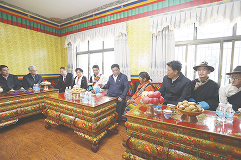 汪洋在色尼區羅瑪鎮凱瑪村視察基層黨組織建設工作情況。他指出,要把中央的惠民政策落到實處,離不開廣大基層幹部的付出,希望大家繼續努力,把家鄉建設得更加美好。汪洋走進牧民普次仁家中,查看中央代表團贈送的紀念品。聽到他們在家門口實現就業,過上了富裕幸福的日子,汪洋十分高興,勉勵他們繼續用勤勞的雙手創造更加美好的生活。