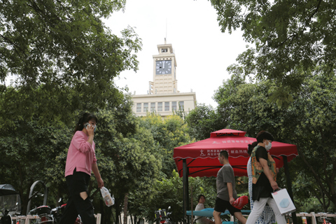 ◎ 八月二十六日,市民從西安報話大樓附近走過。為給西安市民和遊客提供更精準報時服務,西安報話大樓塔鐘近日開始進行維護改造。西安報話大樓位於西安北大街西華門十字東南角,一九六三年竣工使用,是當時西安的電信通訊樞紐,也是新中國成立後西安市早期標誌性建築之一。(中新社記者 張遠攝)