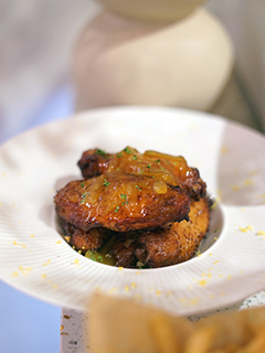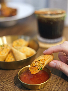手工製作的「O’clock春卷」炸至金黃香脆,裡頭收納了薯泥、洋蔥及三文魚肉等,是店內招牌小食之一,每個客人的檯上都會有它的蹤影。