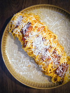 以至少三隻蛋黃來營造眼前這一幕飽和度極高的黃色,充滿咬口的意粉滲透着巴馬臣芝士的鹹香及煙肉的油潤氣息,醬汁的組成中沒帶半點忌廉,即使先因為相機先吃而耽誤了一些時間,麵條仍沒有結成一舊的險象出現,非常加分!