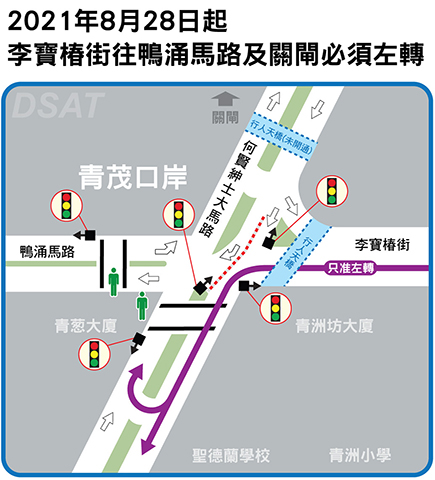 【特訊】為優化青茂口岸周邊交通配套,進一步提升交通安全,交通事務局於何賢紳士大馬路與鴨涌馬路及李寶椿街交界設置交通燈,該路段斑馬線同步取銷,行人可使用交通燈燈控人行橫道及行人天橋;屆時,由李寶椿街往鴨涌馬路及關閘廣場方向之車輛,必須左轉往何賢紳士大馬路近聖德蘭學校位置掉頭。
