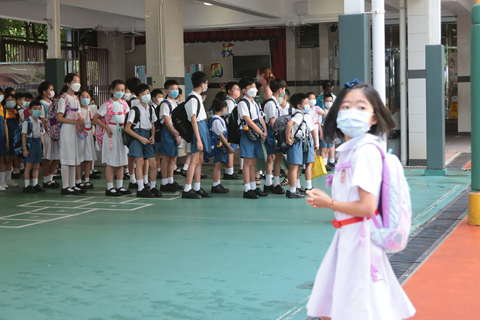 當天上午八時許,在香港荃灣寶血會思源小學,一場舉行升國旗及奏國歌儀式的開學禮,讓小學生暑假後「收心」。