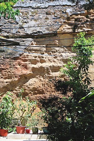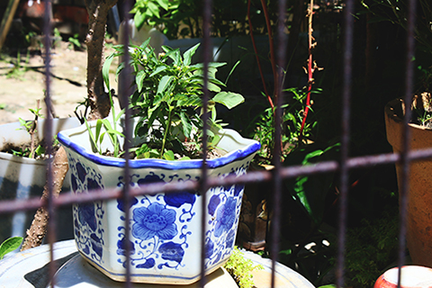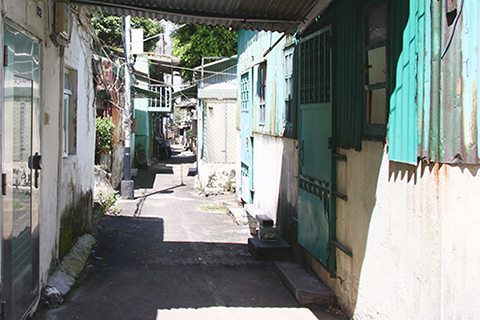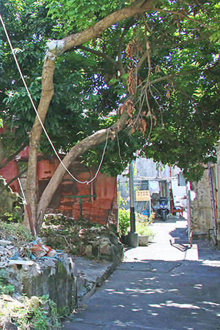 圍村共有四條巷,地勢較低且有圍牆與高園街、新勝街相隔,自成一角。圍內還植有果樹、花草,處處綠蔭,富有田園風情,仿與繁華鬧市隔絕,倒也安靜恬適。只見鐵皮屋、木屋、石屋等平房建築毗鄰,光影斑駁。磚墻外植被自然分落,古樹在光照下樹影婆娑,自然又隨性的市井生活,時光彷彿在這裏停滯……