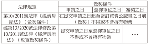二0二0年公佈的第一三/二0二0號法律再對《經濟房屋法》進行修改,上述關於不得擁有物業的期間規定有所放寬。有關不得擁有物業期間由「在提交申請之日起至簽訂買賣公證書之日前(做契)」修改為「提交申請之日至選擇單位之日」。