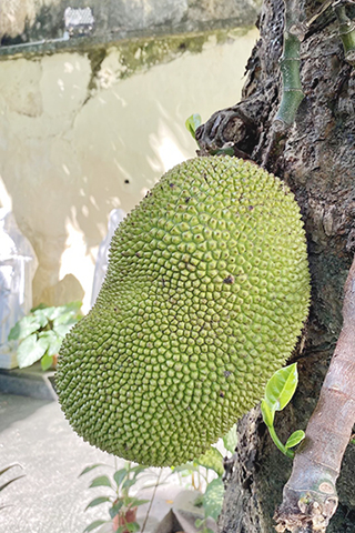 花園裡的玉蘭花樹更見挺拔、大樹菠蘿還掛數個翠綠的果實,據工作員介紹今年大樹菠蘿豐收、但已經過了採摘期。看著眼前沉甸甸的果實不禁遙想當年,大樹菠蘿掛果後大家自覺地不再靠近樹下,但又總是忍不住前往觀察,數一數有多少個、看一看哪個將成熟?每次採摘,同事與中心義工先進入隔壁圖書館樓上,筆者透過圍牆遞上竹竿,合數人之力一下一下地將大樹菠蘿一個又一個地敲下;通常一次會採摘數個將近成熟的果實,放置兩三天就熟透(喜歡的人覺得滿室芳香、不喜歡的人難以忍受)成為中心長者美味的下午茶,一個大樹菠蘿足夠數十人享用。