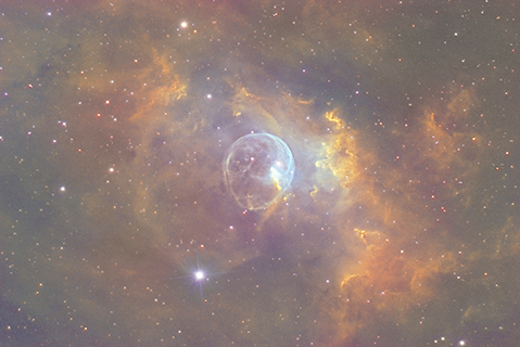 氣泡星雲 (NGC 7365) 是秋季夜空中一個很有趣的宇宙美景,它是位於仙王座之內的一個電離氫區發射星雲,由其中一顆年輕的高溫恆星激發而成的一個獨特氣殼。而我覺得要以SHO /哈勃調色盤的拍攝和處理方法完成,才最能顯出它形態特別的一面。在經過大半年的長焦器材拍攝練習和微調之後,終於可以一起用三套赤道儀和天文望遠鏡,同時間拍攝它的Ha, SII及OIII頻道,使從前六、七晚的拍攝可以縮短在兩晚內完成。