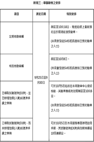 原安排定期檢驗到期日為九月二十七日至十月十八日之車輛,該檢驗期限順延至十月二十二日,車輛利害關係人/車主需提前網上重新預約並於期限前接受驗車;原安排於上述時間進行特別檢驗之車輛,檢驗期限順延至十月二十二日,局方將發送SMS短訊通知上述已預約驗車之人士。