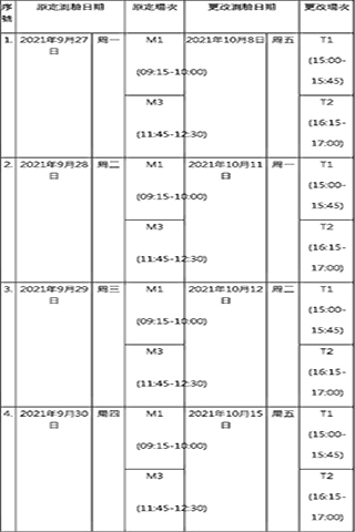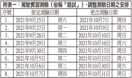 原定於9月25日至10月7日期間參加路試及於9月27日至30日參與筆試之人士,該局將重新安排考期(見附表一及附表二)。倘對考期有異議,或原定於10月5日及6日之筆試考生因故未能出席,可於10月6日或之前經由所屬的駕駛學校申請免費更改一次測驗日期。