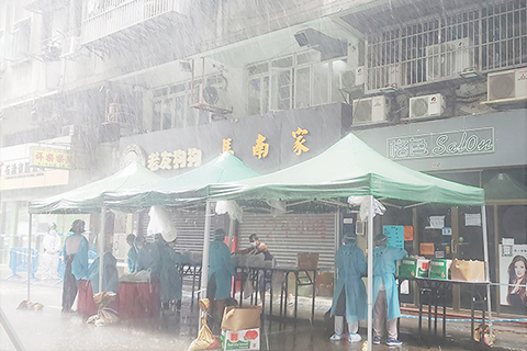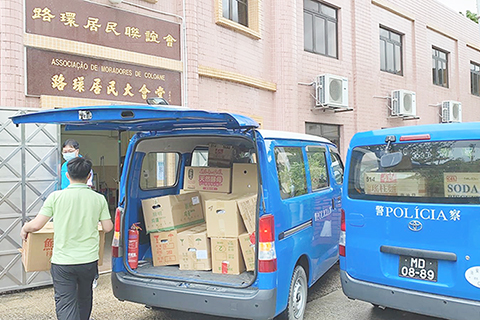 昨日,位於澳門的各個黃紅碼圍封區的熱食飯餐未受颱風影響,如常供應。而受限於物流運輸及戶外環境限制,路環聖方濟各街平民村黃碼區居民的飯餐,則以應急食物包暫替,分發地點亦暫時轉移至路環居民大會堂。