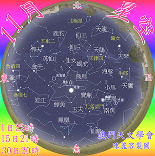 金牛座北流星雨在11月12日極大期(ZHR~5)。獅子座流星雨在11月17日極大期(ZHR~10*)。麒麟座α流星雨在11月21日極大期(ZHR~Var.)。