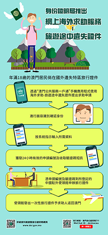 有關「網上海外求助服務─旅遊途中遺失證件」詳情,可參閱www.dsi.gov.mo/ooas_c.jsp。