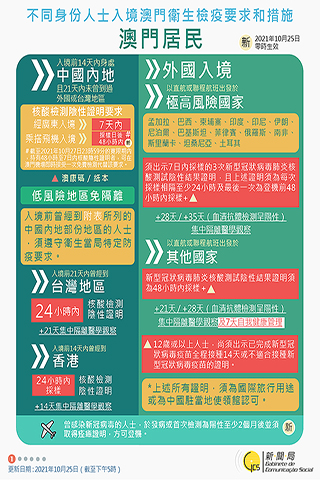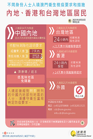 【特訊】新型冠狀病毒感染應變協調中心宣佈,因應黑龍江省及青海省的疫情變化,衛生局根據第二/二00四號法律《傳染病防治法》第十條和第十四條的規定,自二0二一年十月廿九日零時起,所有曾經到過黑龍江省黑河市或青海省西寧市的入境人士,須按照衛生當局的要求在指定地點接受醫學觀察至離開當地後十四天但最短不少於七天。而所有曾經到過上述地方的已入境人士,其健康碼將變為黃碼及須接受自我健康管理至離開當地十四天為止,期間須在開始措施的第一、二、四、七、十二天接受最多五次的新冠病毒核酸檢測。免費核酸檢測預約連結為https://app.ssm.gov.mo/mandatoryrnatestbook。核酸檢測結果不會上載至澳門健康碼亦不可作為出入境用途。如需將核酸檢測結果在澳門健康碼顯示,則須自費檢測。