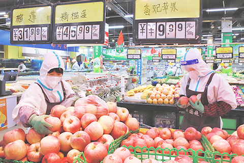 ◎ 十一月四日,黑龍江黑河市,防疫人員根據居民「點餐」內容選購生活必需品。據悉,黑河市十一月三日起關閉所有經營場所,對市區居民生活必需品實行「配送」保障供應。黑河市市場監管局組織商超企業將生活必需品配送到居民小區卡口,由社區網格員負責送到「點餐」的居民家中。(中新社)