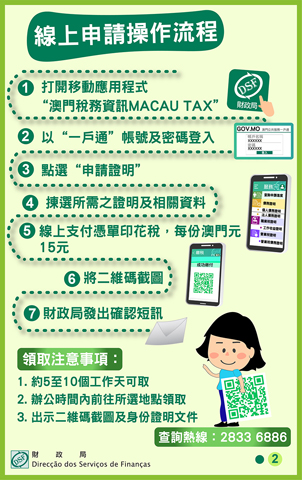 市民只需使用「一戶通」帳號及密碼登入財政局移動應用程式「澳門稅務資訊Macau Tax」,按序點選申請證明的所需資料、申請份數,揀選領取地點,並透過政付通平台、大西洋銀行(BNUAPP)或MPay任一電子支付方式線上支付申請證明需繳納的每份澳門元十五元憑單印花稅,便會即時收到由財政局發出的確認短訊。