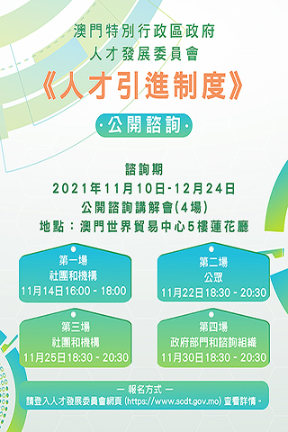此外,為了讓社會對諮詢內容有更深入認識,人才發展委員會將在澳門世界貿易中心五樓蓮花廳舉辨四場諮詢會,具體場次及安排如下︰