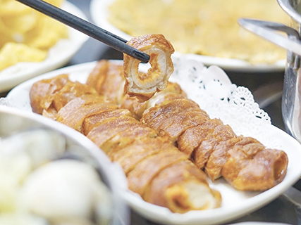 小菜類的選項也不少;香煎魚餅、炸車仔魚球、冰鎮八爪魚、炸鴛鴦及燒腸都是這裡的架勢之作,每一款,都讓人有想乾杯暢飲的念頭!炸鴛鴦即以魚滑或鮮蝦作為內餡的雲吞,雲吞皮炸得金黃又酥香,其厚度與餡料的比例恰好,與開胃又惹味的甜酸醬是絕配也!◇