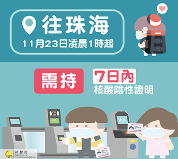 【特訊】珠澳聯防聯控澳方工作組接珠海方面通知:根據當前疫情防控需要,經珠澳聯防聯控機制協商一致,自二0二一年十一月廿三日一時起,經珠澳口岸入境(珠海)人員需持七日內核酸檢測陰性結果證明。現有(珠海)出境疫情防控措施保持不變。