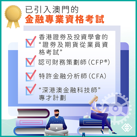 在金管局的推動下,澳門金融學會與多個專業資格協會合作,今年在澳門先後引入美國認可財務策劃師(CFPR)、香港「證券及期貨從業員資格考試」、「深港澳金融科技師」專才計劃三個專業資格考試,目前已舉辦了六場考試,吸引眾多金融從業員和在讀大學生報名。此外,特許金融分析師(CFA)亦已於今年在澳門開辦考試。