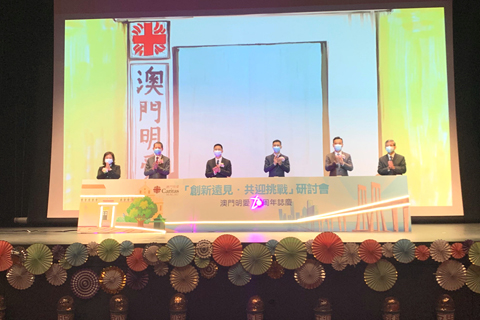 澳門明愛七十周年」創新遠見.共迎挑戰」研討會開幕式昨日早上九時三十分假何黎婉華庇道演藝劇院舉行,社工局局長韓衛、衛生局局長羅奕龍、中聯辦副部長級助理姜正宇、澳門基金會行政委員會委員區榮智、教育及青年發展局教育心理輔導及特殊教育中心主任周佩玲和明愛總幹事潘志明等主持。