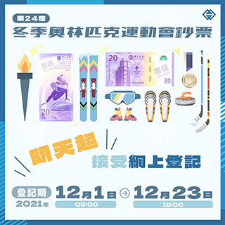 【特訊】第二十四屆冬季奧林匹克運動會鈔票網上登記將於二零二一年十二月一日(上午九時起)開始,澳門居民可透過澳門金融管理局的網頁進行兌換預約登記,每名澳門居民僅可登記一次及可兌換兩張鈔票,登記期至二零二一年十二月二十三日下午六時止。
