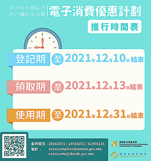 【特訊】「電子消費優惠計劃」的最後登記日為12月10日,逾期將無法登記及領取電子消費優惠。呼籲尚未登記的澳門居民,請於登記期屆滿前辦理網上登記。