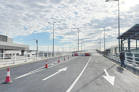 北安大馬路連接新城E2區行車天橋已經完工,行車天橋跨越氹仔客運碼頭與澳門國際機場之間的海空聯運專道,為配合專道的安保需要,現正在行車天橋安裝圍網,預計明年上半年通車。