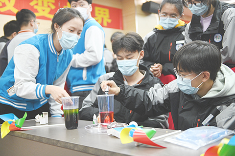 在水膜張力實驗中,王亞平將和女兒在地球上一同製作的花朵折紙放進水膜中,原本小小的折紙在太空中瞬間綻放成一朵美麗的「花朵」。面對一千四百二十名中小學生代表和觀看直播的全國中小學生,王亞平說:「同學們,你們都是祖國的花朵,含苞待放,未來是你們的。希望你們的夢想都能在這廣袤的宇宙中綻放。」