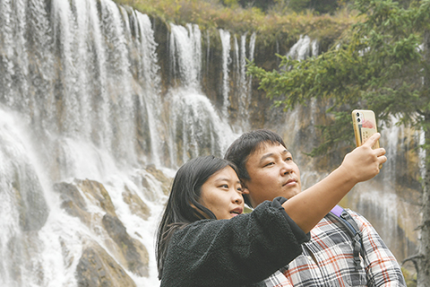 ◎ 遊客在諾日朗瀑布前拍照留念。